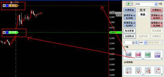 把下單模式拖拉到K棒正在運行的視窗,滑鼠移到想要的價位,這邊就會顯示掛單的情形